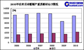 日本鋼鐵行業(yè)在全球鋼鐵行業(yè)有著世界舉足輕重地位,產(chǎn)量僅次于中國,位列全球第二。 日本鋼材出口占其產(chǎn)量比重較大,2010年出口4340萬噸,占比接近40%,較2005年上升約10個百分點(diǎn)。